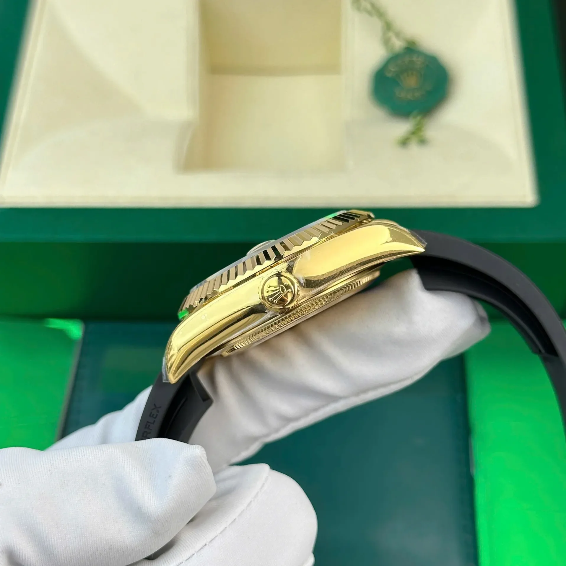 Das Oyster-Armband aus 18K Gelbgold mit Oysterclasp und Easylink bietet luxuriösen Tragekomfort. Wasserdicht bis 100 Meter.