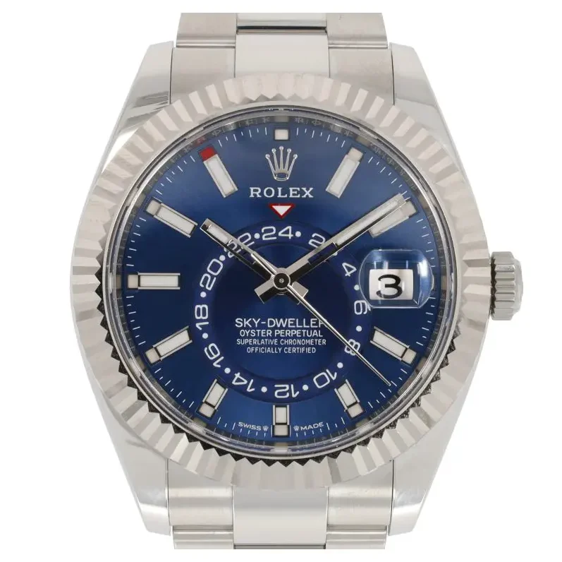 Die Rolex Sky-Dweller 336934 mit blauem Zifferblatt und Oyster-Armband ist die sportliche Stahl-Variante der aktuellen Generation. Das tiefe Blau mit Sonnenschliff erzeugt faszinierende Lichtreflexe.