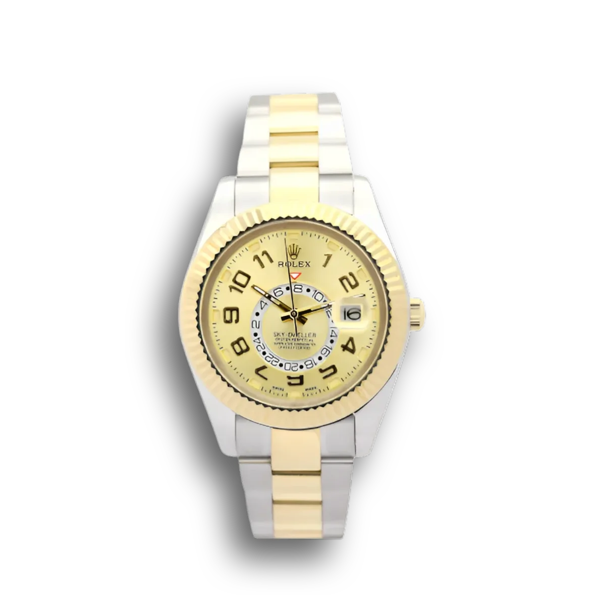 Die Rolex Sky-Dweller 326938 in Vollgold mit goldenem Zifferblatt ist ein Statement klassischer Rolex-Eleganz. Das goldene Sonnenschliff-Zifferblatt verschmilzt harmonisch mit dem 18K Gelbgoldgehäuse.
