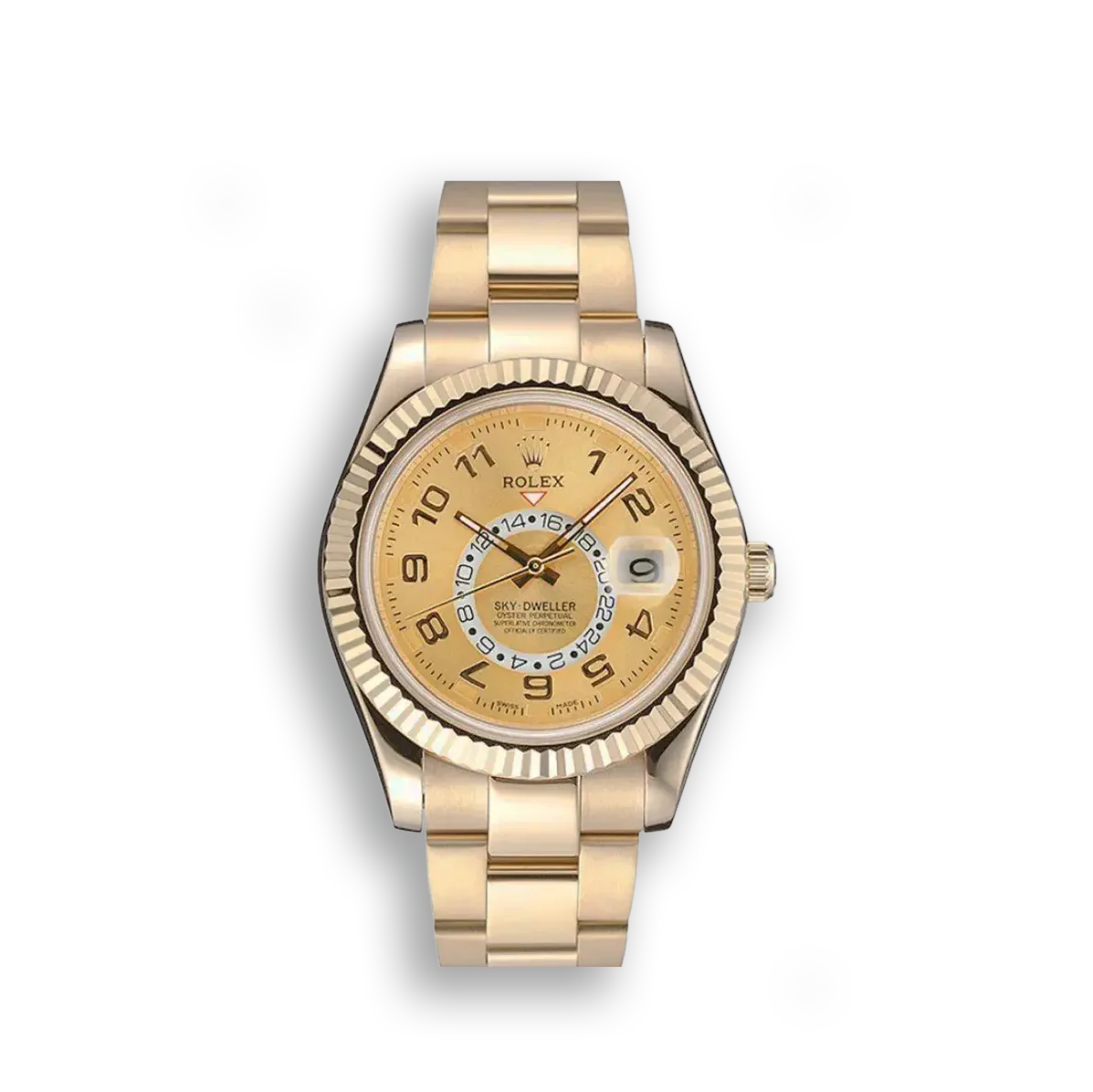 Die Rolex Sky-Dweller mit goldenem Zifferblatt und Gelbgoldgehäuse verkörpert höchste Uhrmacherkunst. Das Sonnenschliff-Finish des Zifferblatts erzeugt bei jedem Lichteinfall faszinierende Reflexe.