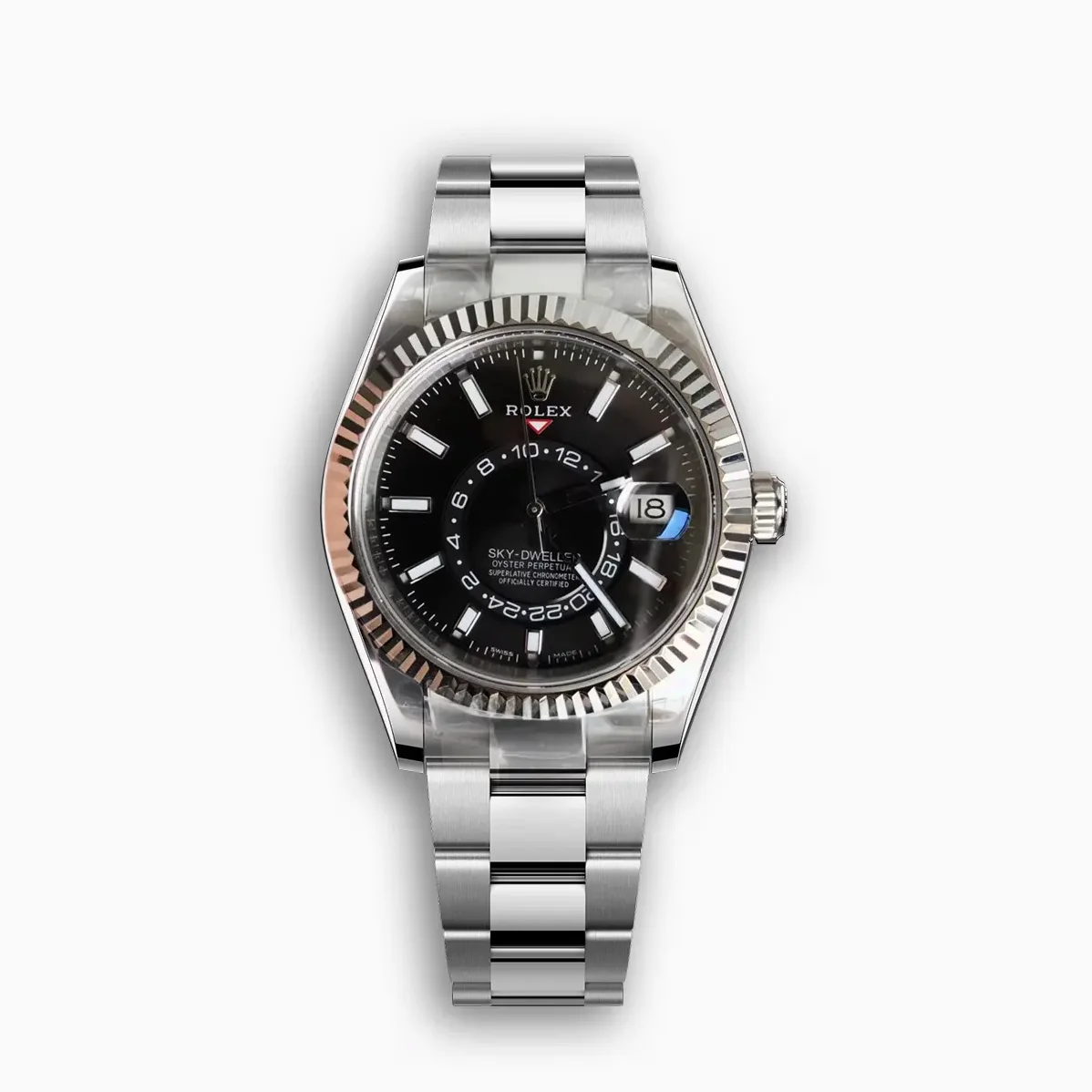 Das 42mm Edelstahlgehäuse macht die Sky-Dweller-Komplikation alltagstauglich und robust. Die Weißgold-Lünette mit Ring Command System setzt einen dezenten Luxusakzent.