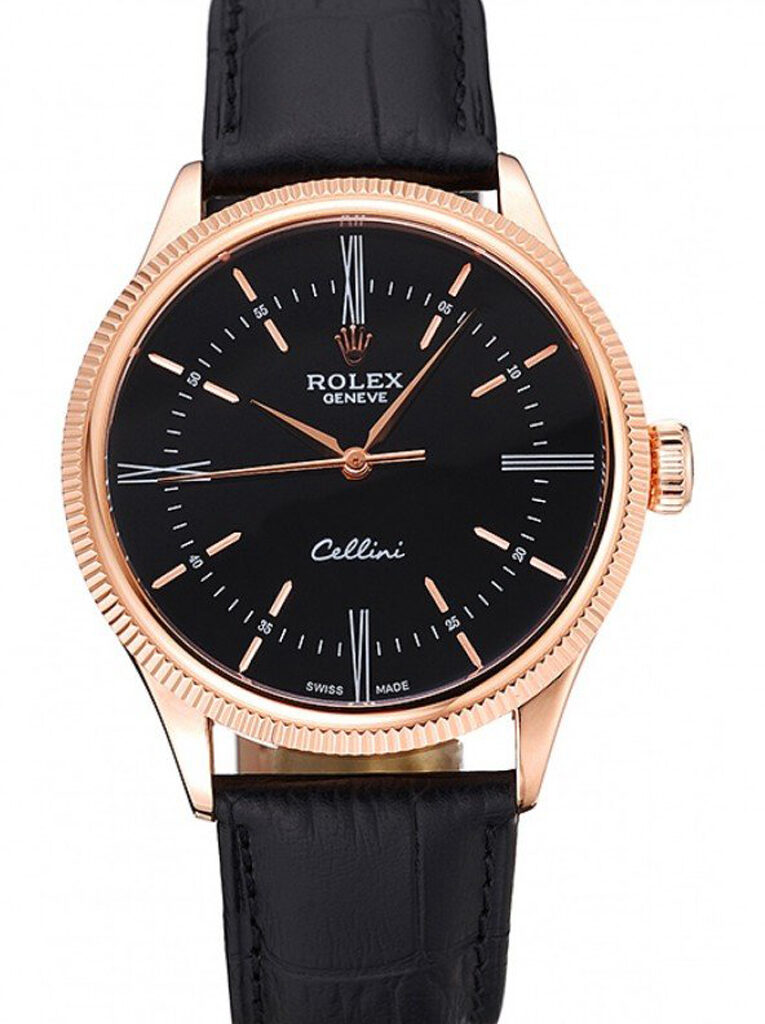 The Rolex Cellini 39mm Black Dial - Bold Elegance verfügt über ein Schwarz Zifferblatt an einem Leather Band-Armband, angetrieben von einem präzisen Automatikwerk. Gefertigt aus Roségold-Vergoldet mit Saphirglas und 30m (Schweizer), bietet diese Cellini-Referenz authentische Rolex-Ästhetik. Erhältlich in 39 mm bietet dieses Präzisionszeitmesser erstklassige Super-Clone-Qualität zu einem attraktiven Preis.