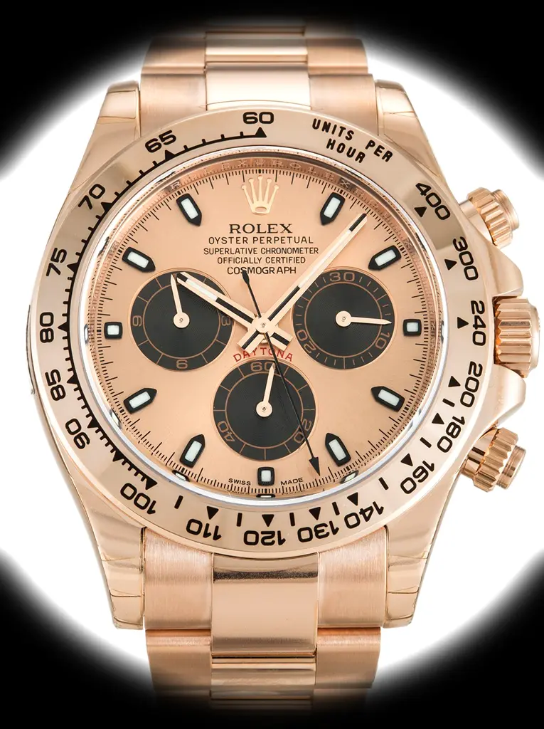 Die Rolex Cosmograph Daytona 116505 Rose Dial 40mm features a Rose Zifferblatt on a Oyster bracelet, angetrieben von einem präzisen automatischen Chronographenwerk. Built for motorsport precision with Sapphire crystal and 30m (Swiss) water resistance, this legendary Daytona chronograph delivers authentic Rolex racing aesthetics. Available in 40 mm, this precision timepiece offers premium quality super clone craftsmanship at an accessible price point.