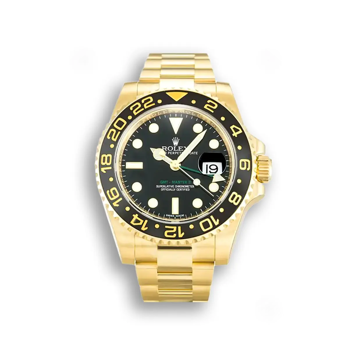 Rolex GMT-Master II 116718 - 40mm Schwarz Zifferblatt Gelbgold — Schweizer Uhrwerk