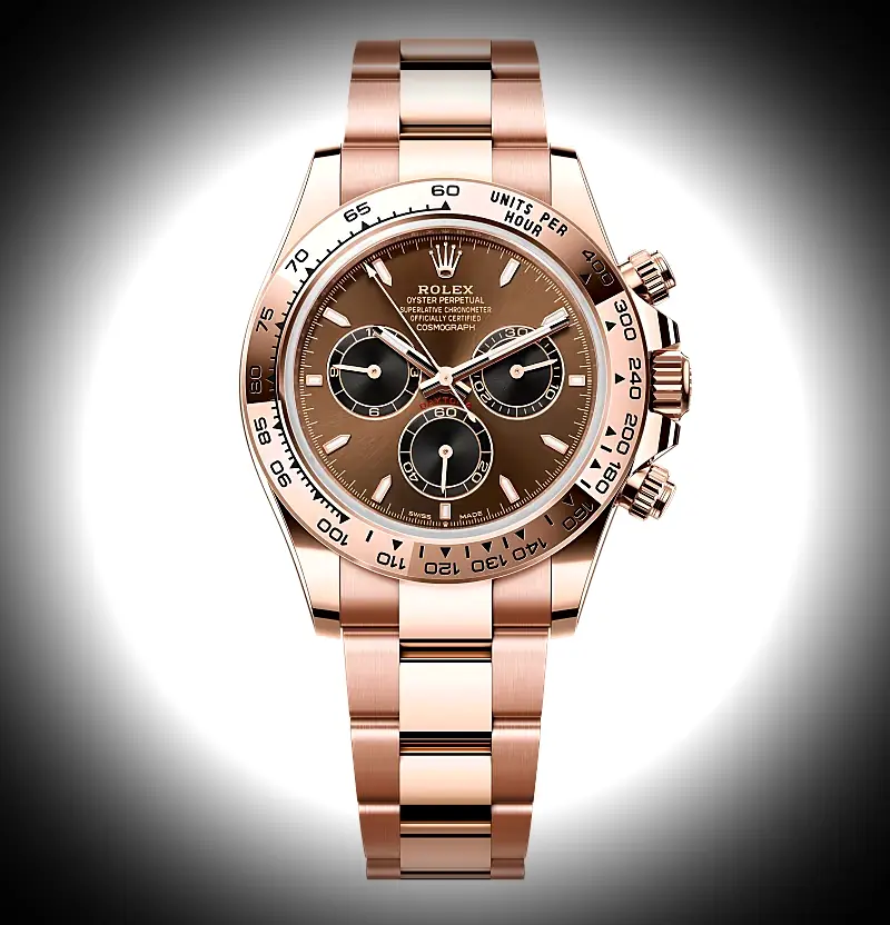 Marke Rolex Modell Daytona Referenz 126505 Uhrwerk Automatik Gehäusedurchmesser 40 mm Gehäusematerial 18k Everose-Gold Bandmaterial 18k Everose-Gold (Oyster) Zifferblattfarbe Leuchtendes Schokolade und Schwarz Qualität Schweizer (ETA) Glas Saphirglas Wasserdichtigkeit Wasserdicht bis 30 Meter.