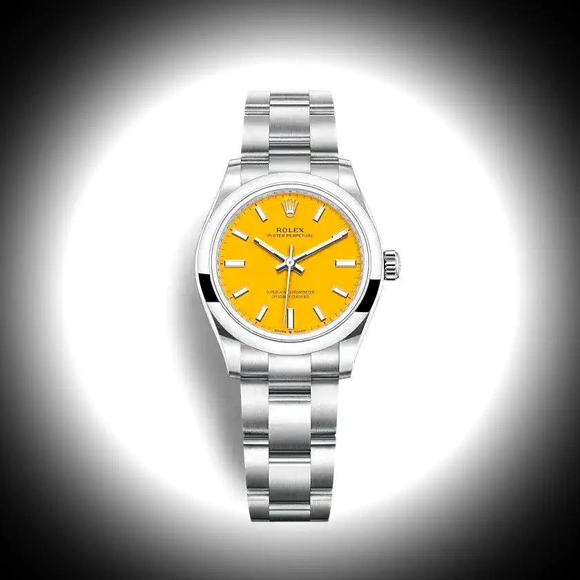 Die Oyster Perpetual 31mm Yellow Dial 277200 zeigt ein Gelb Zifferblatt an einem Oyster-Armband, angetrieben von einem präzisen Automatikwerk. Gefertigt aus Edelstahl mit Saphirglas und 30 m (Schweizer), liefert diese Oyster Perpetual-Referenz authentische Rolex-Ästhetik. Erhältlich in 31 mm – diese elegante Damenuhr bietet erstklassige Super-Clone-Qualität zu einem attraktiven Preis.