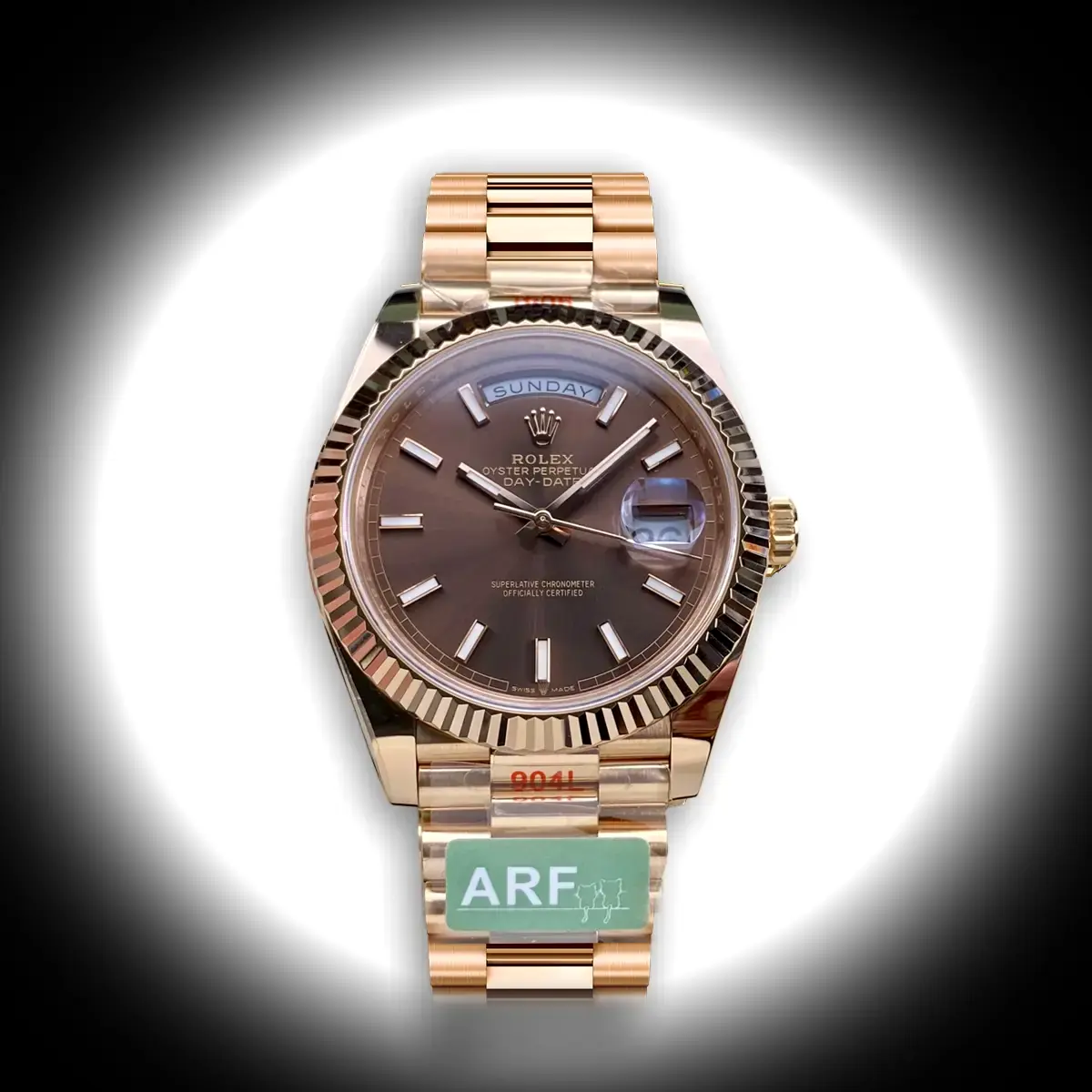 The Rolex Day-Date m228238 with Chocolate Dial verfügt über ein Schokolade Zifferblatt an einem President-Armband, angetrieben von einem präzisen Automatikwerk. Gefertigt aus Gelbgold-Vergoldet mit Saphirglas und 30m (Schweizer), bietet diese hochwertige Day-Date-Referenz das authentische Rolex-Präsidentenuhr-Erlebnis. Erhältlich in 36 mm bietet dieses elegante Damenuhrenmodell erstklassige Super-Clone-Qualität zu einem attraktiven Preis.