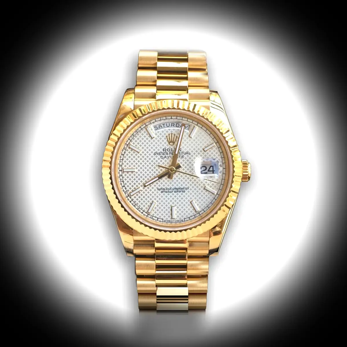 Die Rolex Day-Date 228238 Silver Motiv-Zifferblatt Watch zeigt ein Silber Motives Zifferblatt am President-Armband, angetrieben von einem präzisen Automatikwerk. Gefertigt aus Gelbgold vergoldet mit Saphirglas und 30 m (Schweizer) Wasserdichtigkeit liefert diese prestigious Day-Date-Referenz das authentische Erlebnis einer Rolex Presidents-Uhr. Verfügbar in 36 mm bietet dieser elegante Damenuhr erstklassige Super Clone-Handwerkskunst zu einem attraktiven Preis.