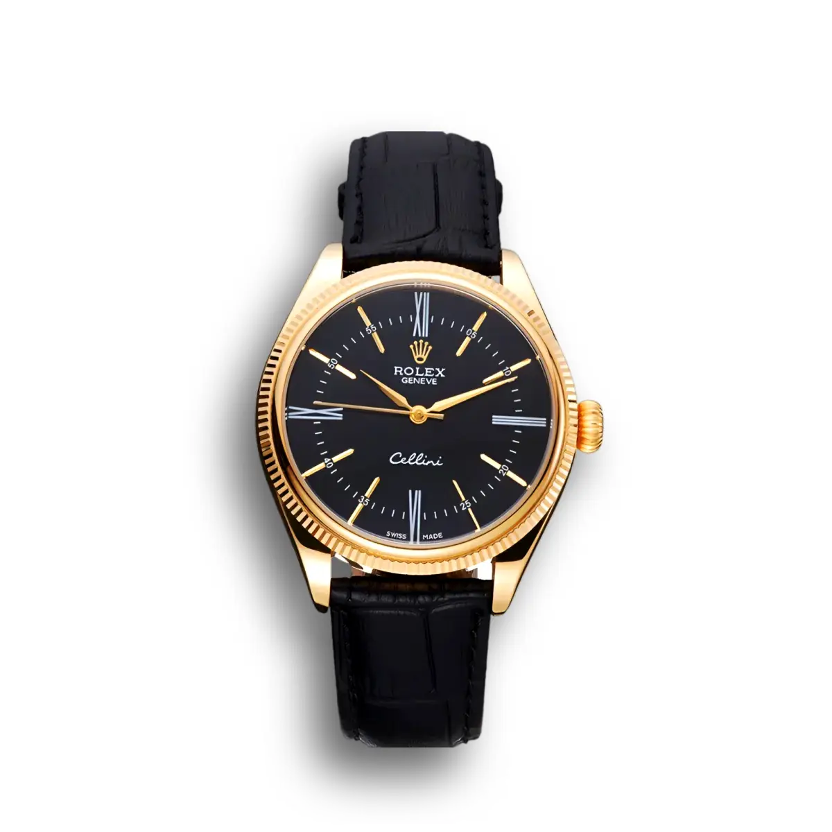 The Rolex Cellini 40mm Black Dial – Ref. 622832 verfügt über ein Schwarz Zifferblatt an einem Leather Band-Armband, angetrieben von einem präzisen Automatikwerk. Gefertigt aus Gelbgold-Vergoldet mit Saphirglas und 30m (Schweizer), bietet diese Cellini-Referenz authentische Rolex-Ästhetik. Erhältlich in 40 mm bietet dieses Präzisionszeitmesser erstklassige Super-Clone-Qualität zu einem attraktiven Preis.
