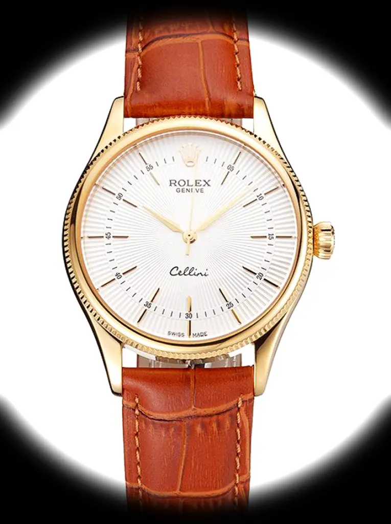 The Rolex Cellini 38mm White Dial - Refined Style verfügt über ein weißen Zifferblatt an einem Lederband, angetrieben von einem präzisen Automatikwerk. Gefertigt aus Gelbgold vergoldet mit Saphirglas und 30m (Swiss), liefert diese Cellini-Referenz authentische Rolex-Ästhetik. Erhältlich in 38 mm bietet dieses Präzisionszeitmesser hochwertige Super-Clone-Handwerkskunst zu einem erschwinglichen Preis.