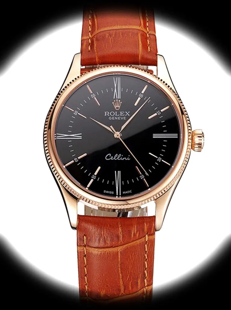 The Rolex Cellini 38mm Black Dial – REP016794 verfügt über ein schwarzen Zifferblatt an einem Lederband, angetrieben von einem präzisen Automatikwerk. Gefertigt aus Roségold vergoldet mit Saphirglas und 30m (Swiss), liefert diese Cellini-Referenz authentische Rolex-Ästhetik. Erhältlich in 38 mm bietet dieses Präzisionszeitmesser hochwertige Super-Clone-Handwerkskunst zu einem erschwinglichen Preis.