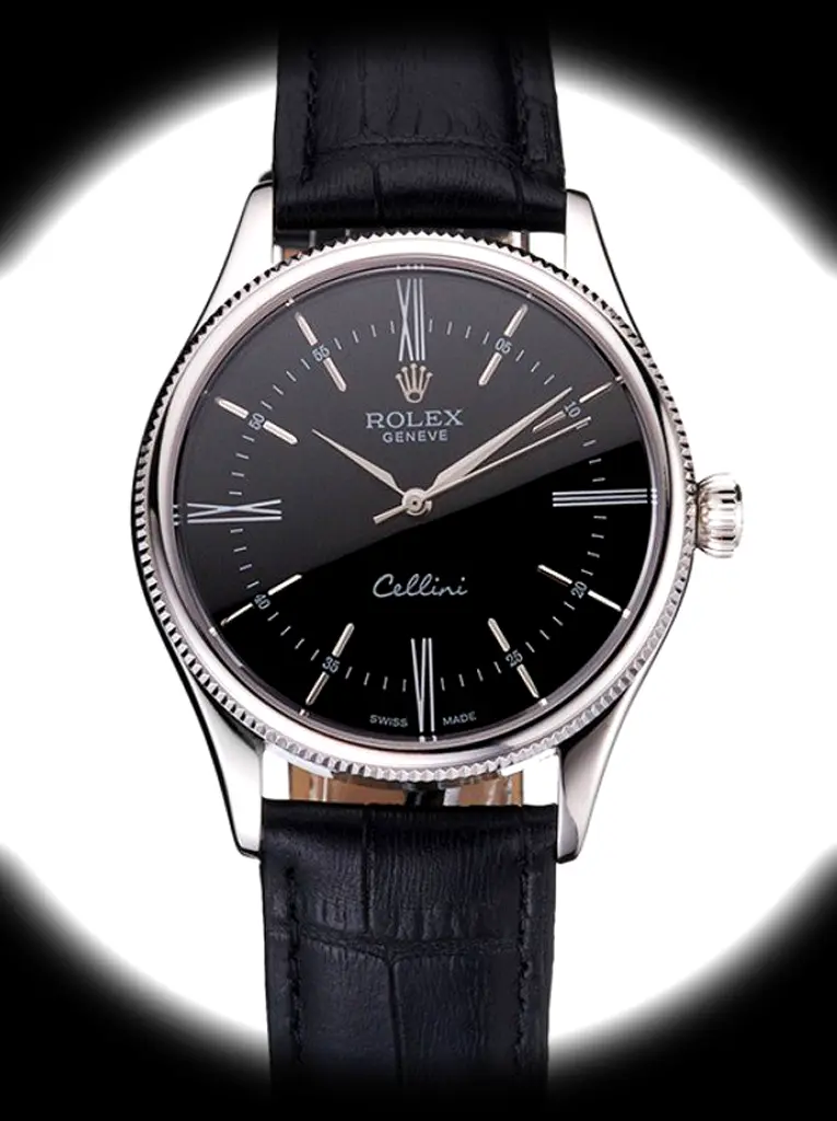 The Rolex Cellini 38mm Black Dial - Refined Elegance verfügt über ein schwarzen Zifferblatt an einem Lederband, angetrieben von einem präzisen Automatikwerk. Gefertigt aus Edelstahl mit Saphirglas und 30m (Swiss), liefert diese Cellini-Referenz authentische Rolex-Ästhetik. Erhältlich in 38 mm bietet dieses Präzisionszeitmesser hochwertige Super-Clone-Handwerkskunst zu einem erschwinglichen Preis.