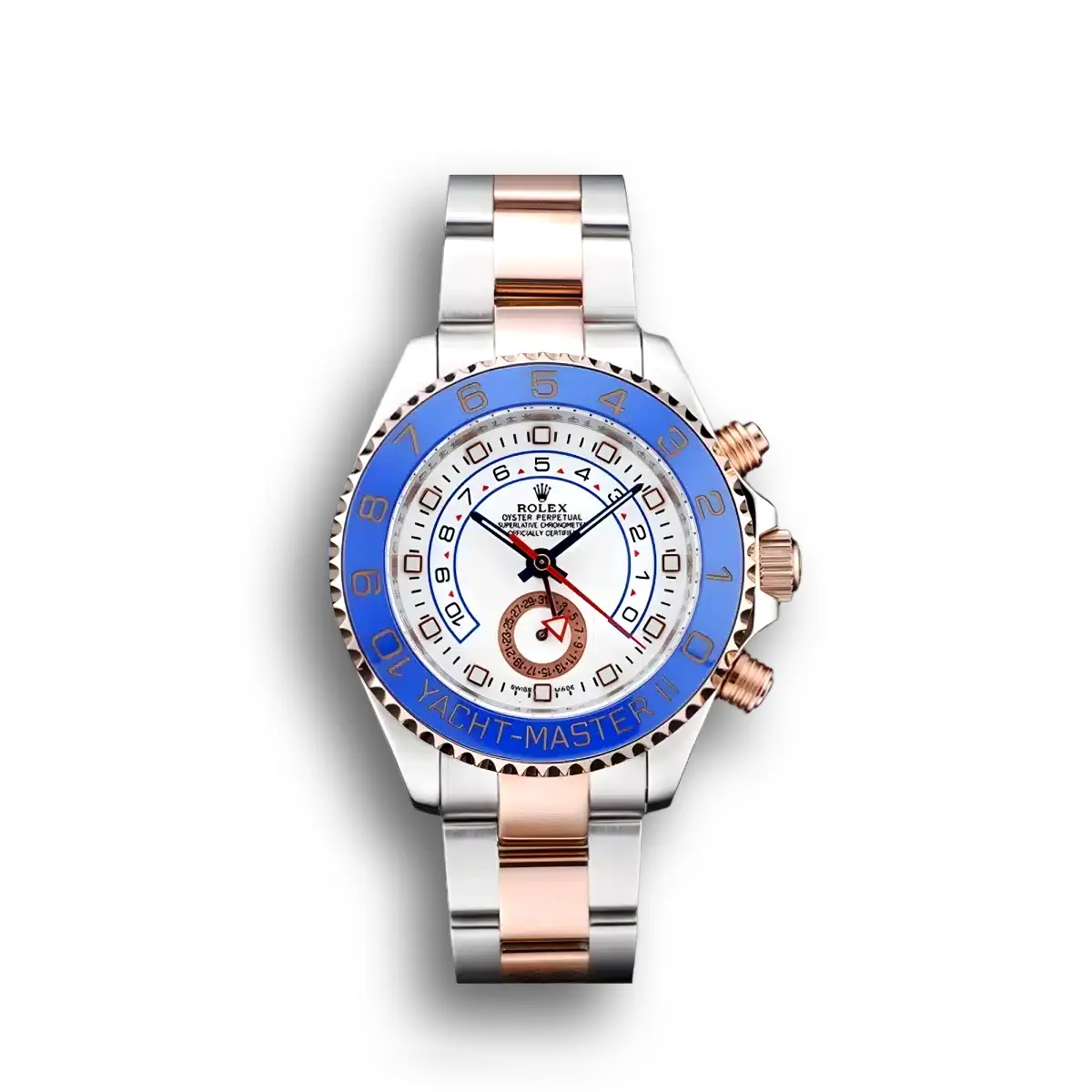 The Rolex Yacht-Master 42mm White Dial SC016833 verfügt über ein weißen Zifferblatt an einem Oyster-Armband, angetrieben von einem präzisen Automatikwerk. Gefertigt aus Edelstahl & Roségold vergoldet mit Saphirglas und 30m (Swiss), liefert diese Yacht-Master-Referenz authentische Rolex-Ästhetik. Erhältlich in 42 mm bietet dieses Präzisionszeitmesser hochwertige Super-Clone-Handwerkskunst zu einem erschwinglichen Preis.