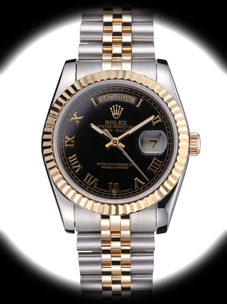 The Rolex Day-Date 36mm Black Dial SRL78 verfügt über ein schwarzen Zifferblatt an einem Jubilee-Armband, angetrieben von einem präzisen Automatikwerk. Crafted in Edelstahl & Gelbgold Plated with Sapphire crystal and 30m (Swiss), this prestigious Day-Date reference delivers the authentic Rolex Presidents watch experience. Available in 36 mm, this elegant ladies timepiece offers premium quality super clone craftsmanship at an accessible price point.